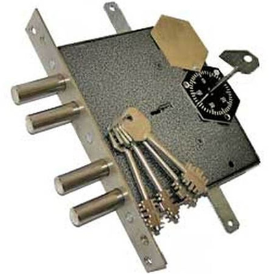 Врезной сувальдно-кодовый замок. Модели присвоен самый высокий класс безопасности. Кодовый механизм блокирует доступ к сувальдному, поэтому открыть дверь получится только зная цифровую комбинацию. Трехзначный шифр присваивается заводом-изготовителем. Кодовую блокировку не обязательно использовать при каждом запирании, без него замок функционирует как обычный сувальдный механизм с четырьмя стальными ригелями.